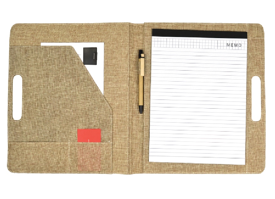 Porta documentos que incluye block de notas, bolígrafo y porta tarjetas.