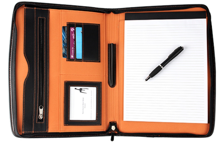 Carpeta con cierre y block, con porta tarjetas.