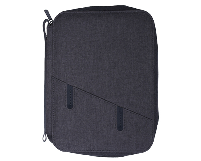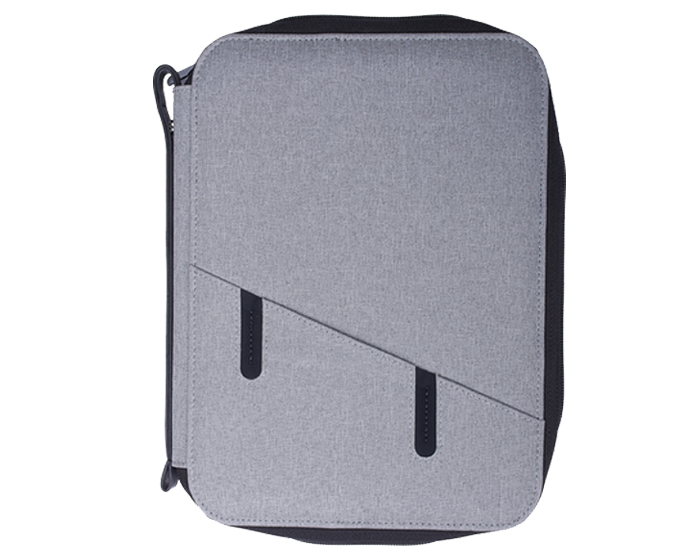 Moderna carpeta multiusos con cierre, con exterior e interior en tela. Incluye libreta tamaño A5 de 64 hojas rayadas (128 páginas). Cuenta con funda al frente para Smartphone, compartimento interior para tablet, 2 soportes ajustables portatablet o portacelular, cinta elástica para Smartphone y cinta elástica para memorias USB u otros accesorios, compartimento con ventana plástica para credenciales, divisiones para tarjetas, bolsa de malla, agarradera exterior con broche de presión, así como cinta elástica
