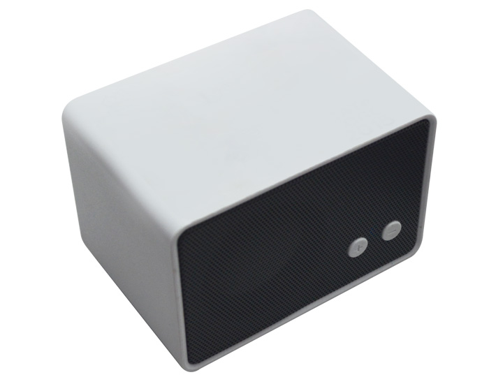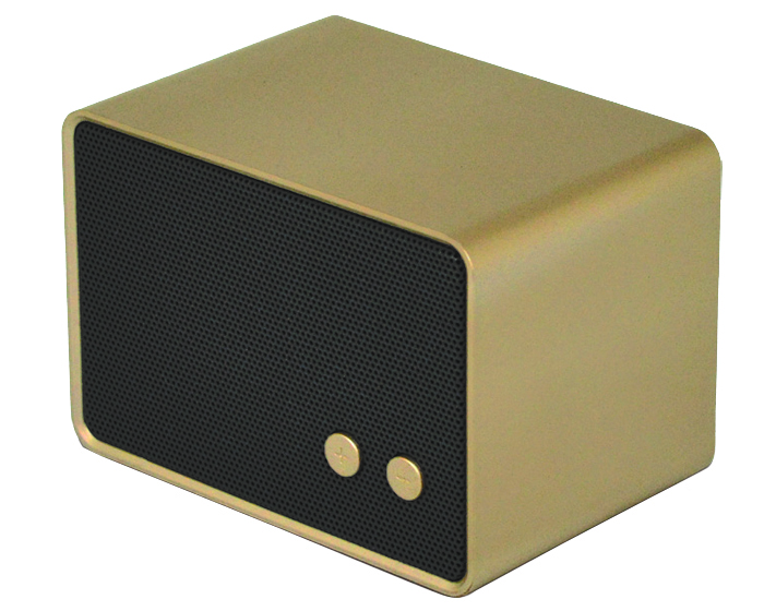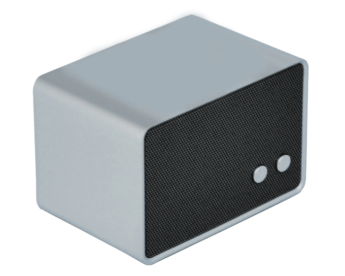 Bocina portátil de tecnología bluetooth con batería recargable. Incluye dos cables: a) para carga de batería y b) para conexión de audio, cuenta con interruptor de encendido/apagado y botones para control de volumen.