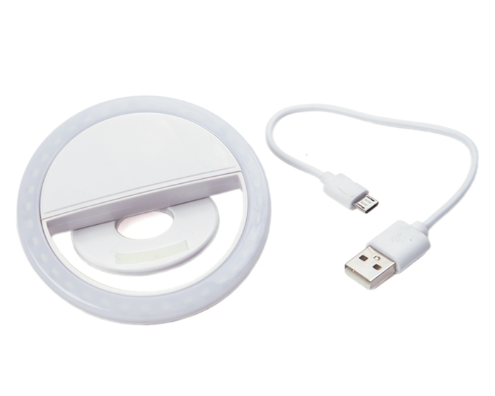Aro de luz LED para tomar fotos en situaciones de poca luz. Cuenta con 3 variaciones de luz. Brinda aproximadamente 60 minutos de luz continua. Incluye cable de carga USB.