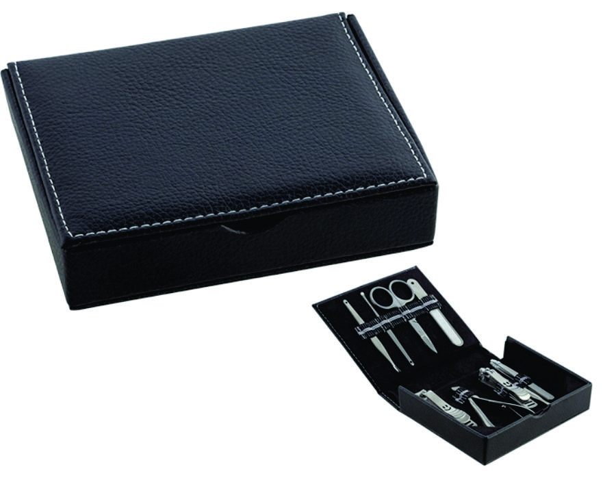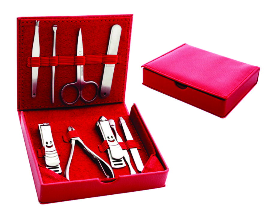 Set de manicure calidad profesional. Incluye 8 piezas: 2 cortauñas, pinzas para depilar, lima, limpiauñas, tijeras, cortacutícula, alicata y levanta-cuticula.