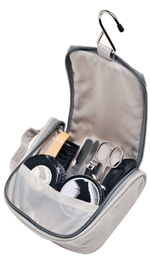 Bolsa multiusos, desplegable, con varios compartimentos, incluye: kit de lustrado y kit de manicure.