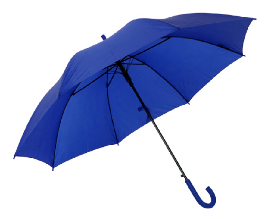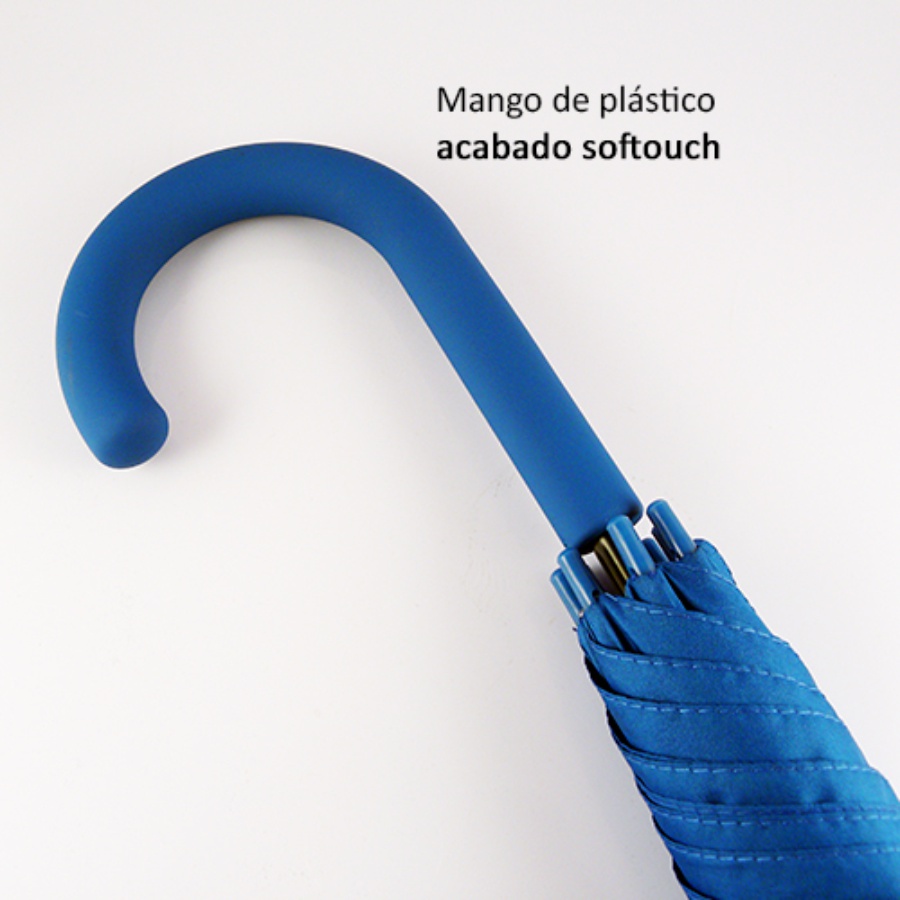 Paraguas en pongee, de 23 y 8 costillas; auto open; marco en metal y costillas en fibra de vidrio; mango de plástico, colores: azul, negro, blanco, naranja y rojo.