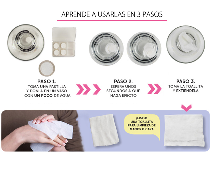 Toallitas de limpieza com primidas en presentación de pastillas que se expanden hasta 38 x 25 cm. Solo hay que agregar un poco de agua para que haga efecto. ¡Ideales para viaje!