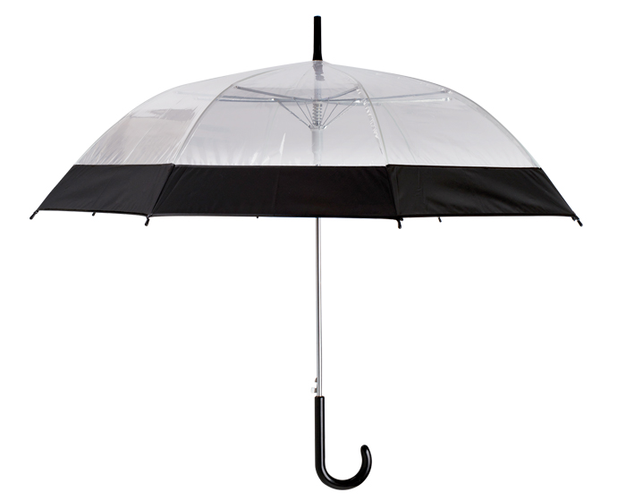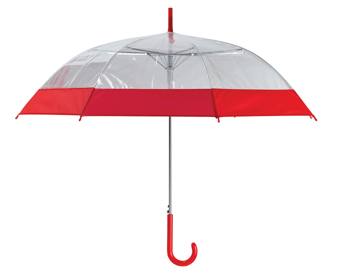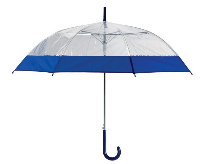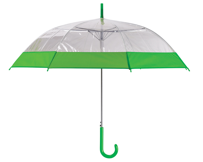 Paraguas de PVC transparente con banda de color y mango curvo de plástico. Apertura automática.