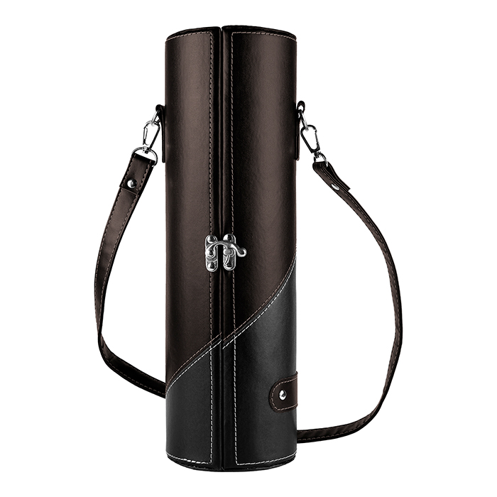 Set de vino en color café con negro con porta botella, saca corchos, cierre con broche de seguridad y correa fabricado en curpiel.