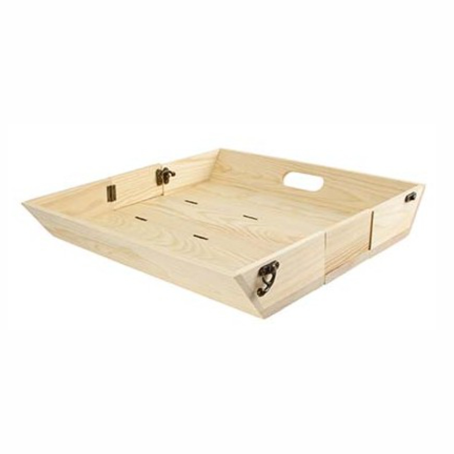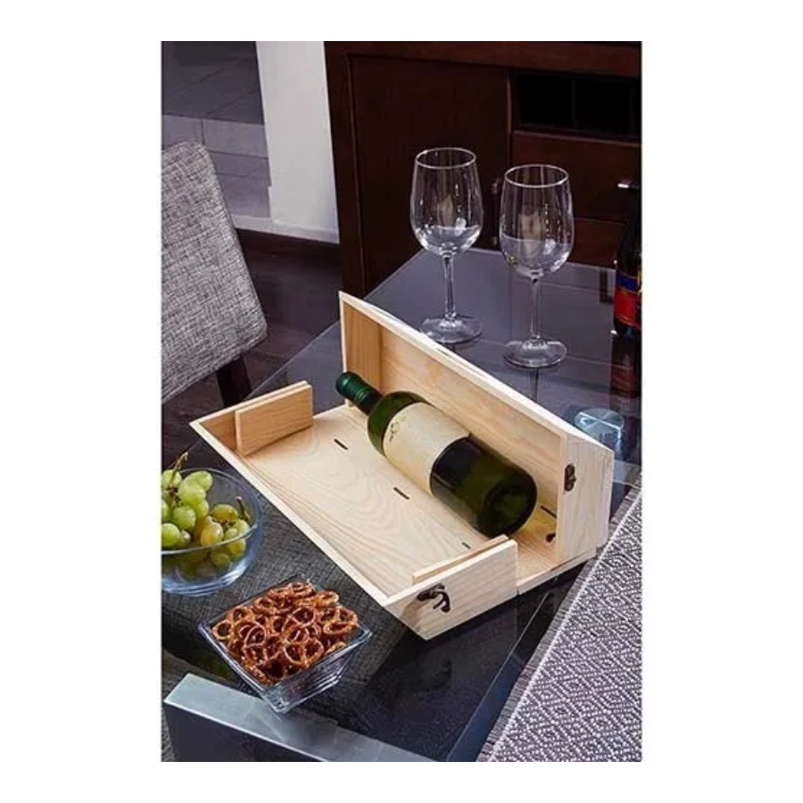 CAJA DE MADERA NATURAL DE PINO PORTA VINOS Y CHAROLA