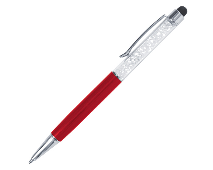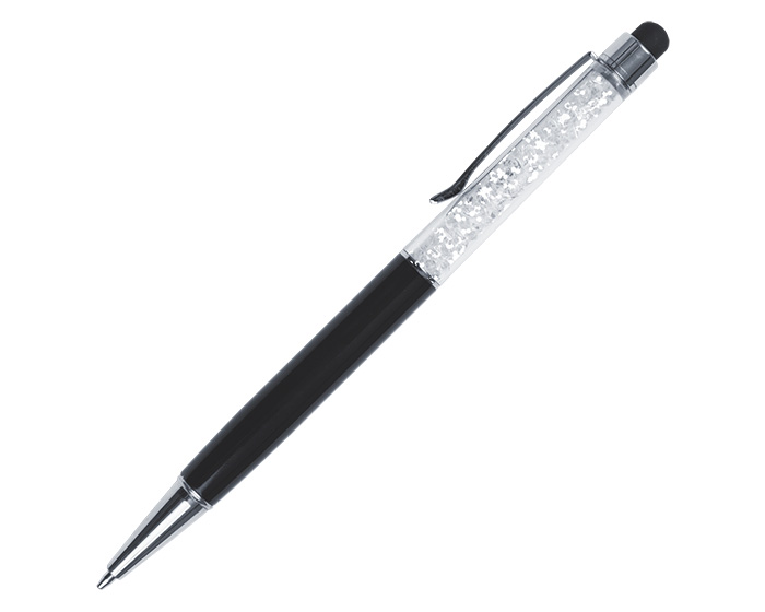 Bolígrafo de aluminio retráctil con clip metálico y punta touch. Cuenta con un barril de cristales brillantes.