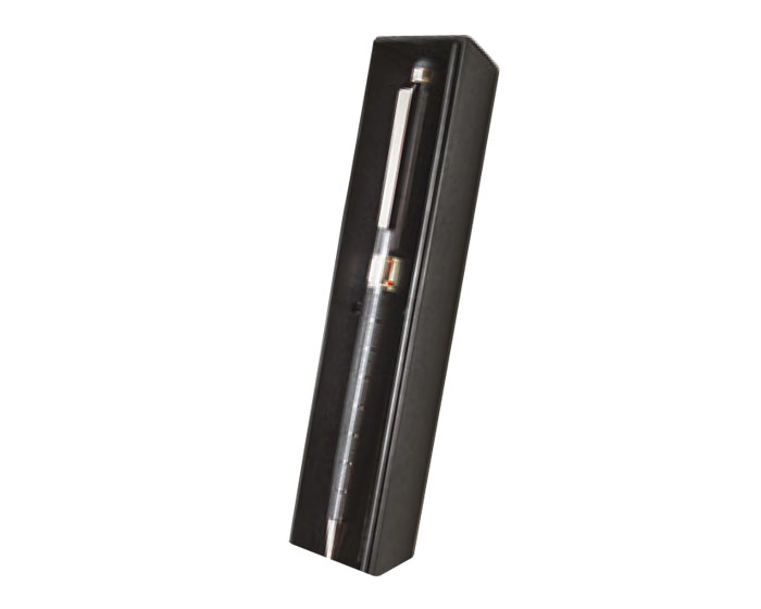 Bolígrafo con un refinado diseño en líneas horizontales de realce, punta de acero inoxidable, clip y anillo en color plata, con puntero para pantallas táctiles. Escriba con comodidad y elegancia. Mecanismo retráctil. Presentación: caja de regalo.