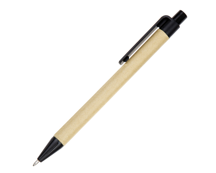Bolígrafo de papel reciclable, clip y punta de plástico. Mecanismo de click.