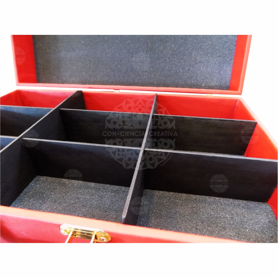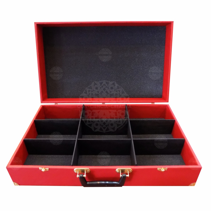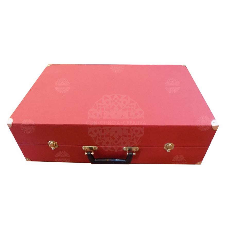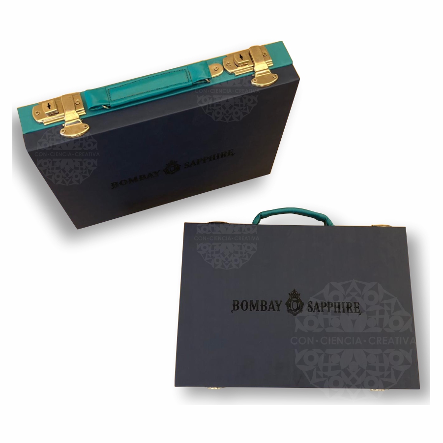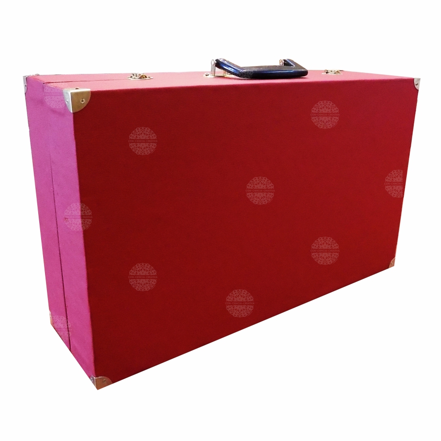 Maletín de MDF de 6 mm. forrado de vinipiel con detalles, herrajes y bisagras metálicos.