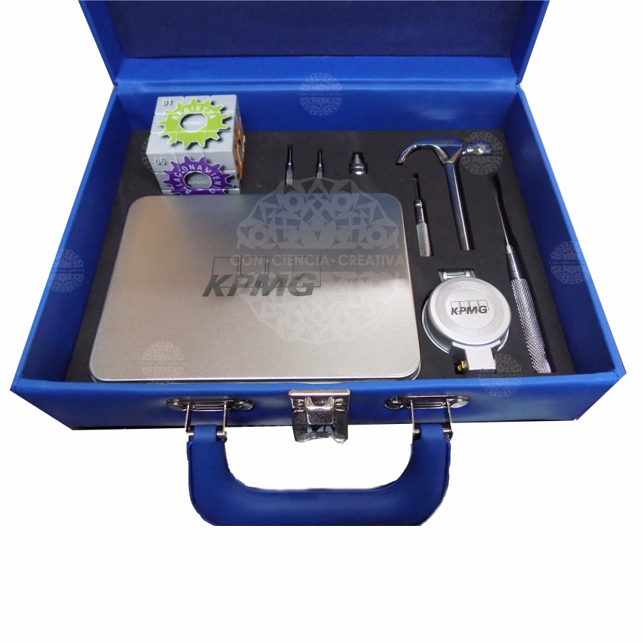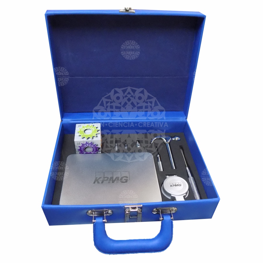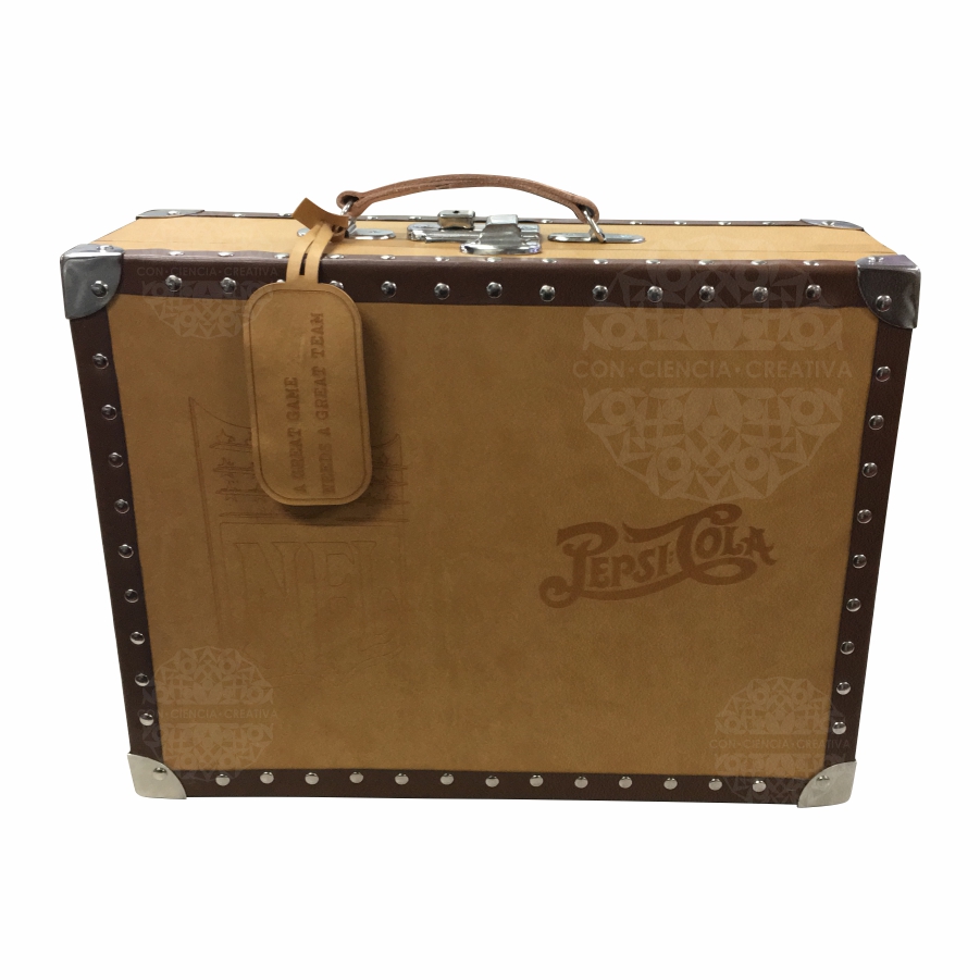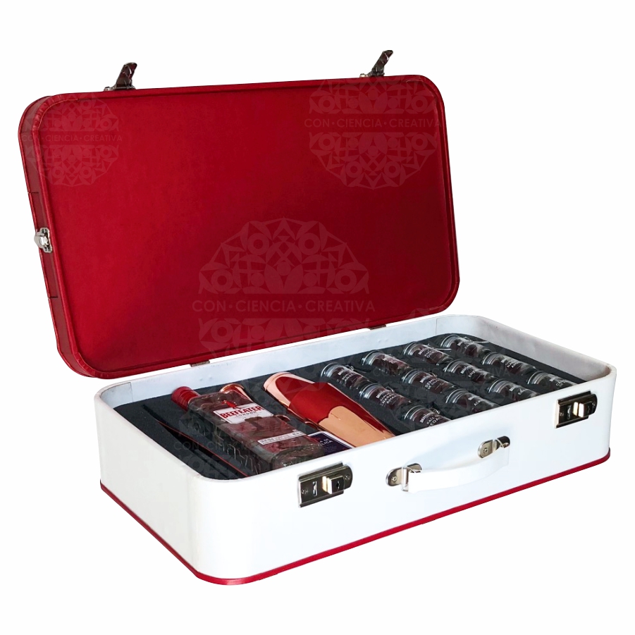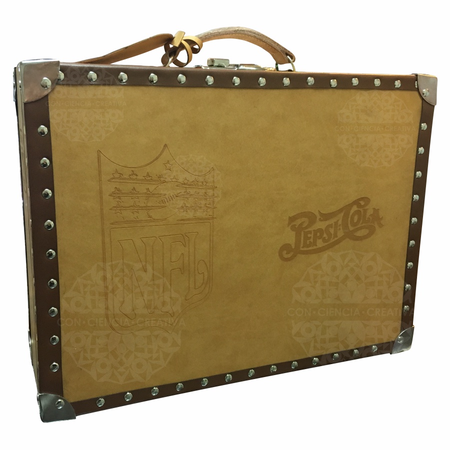 Maletín de MDF de 6 mm. forrado de vinipiel con detalles, herrajes y bisagras metálicos.