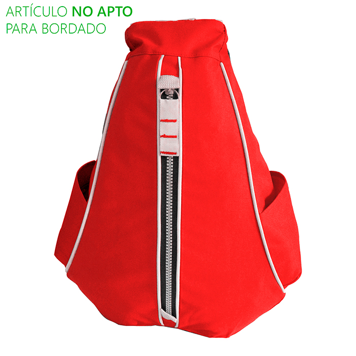 Mochila sport triangular con cierre frontal, colores: rojo, azul, negro y naranja.