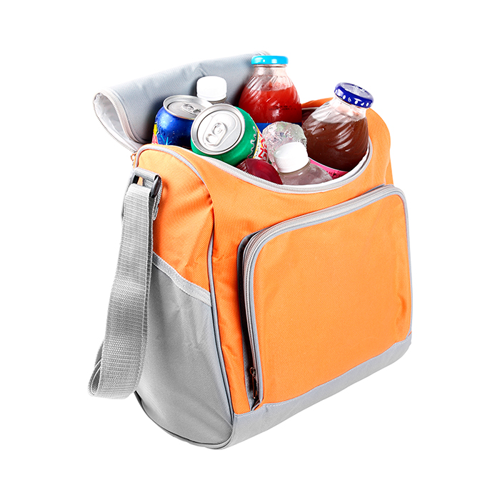 Hielera cool thai de nylon con asa, colores: naranja, azul agua, verde y amarillo.
