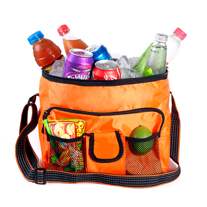 Hielera térmica Boston 16 pack con asa, colores: azul, naranja, blanco y rojo.