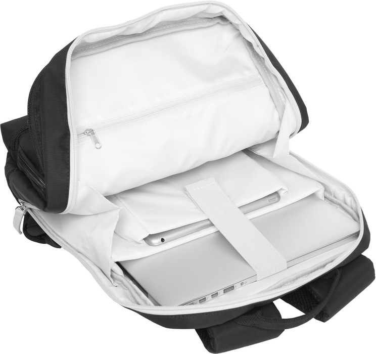Dos compartimentos acolchados y forrados. En el exterior bolsillo frontal con apertura superior, bolsillo lateral y bolsillo inferior con cierres. El compartimento principal con espacio acolchado para notebook, otro para tablet y un amplio bolsillo con cierre, el segundo con bolsillo. Espaldar y correas acolchadas con red que permite la ventilación de la espalda. Correas ajustables. Cierres con tiradores en simil cuero.