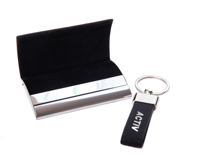 Estuche ejecutivo con tarjetero y llavero a juego. Presentación: caja en color negro. Ideal para grabado láser, con el cual destapa en color plata.