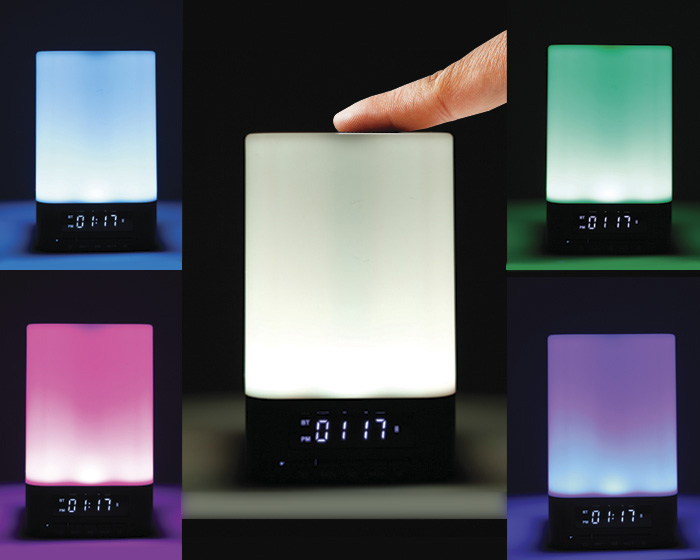 Bocina bluetooth manos libres con reloj y alarma digital. Tecnología touch en la bocina para controlar los diferentes LEDS ambientales de colores. Cuenta con botón de encendido, controles de audio y entrada AUX. Incluye cable de carga y cable AUX. Presentación: caja en color blanco.